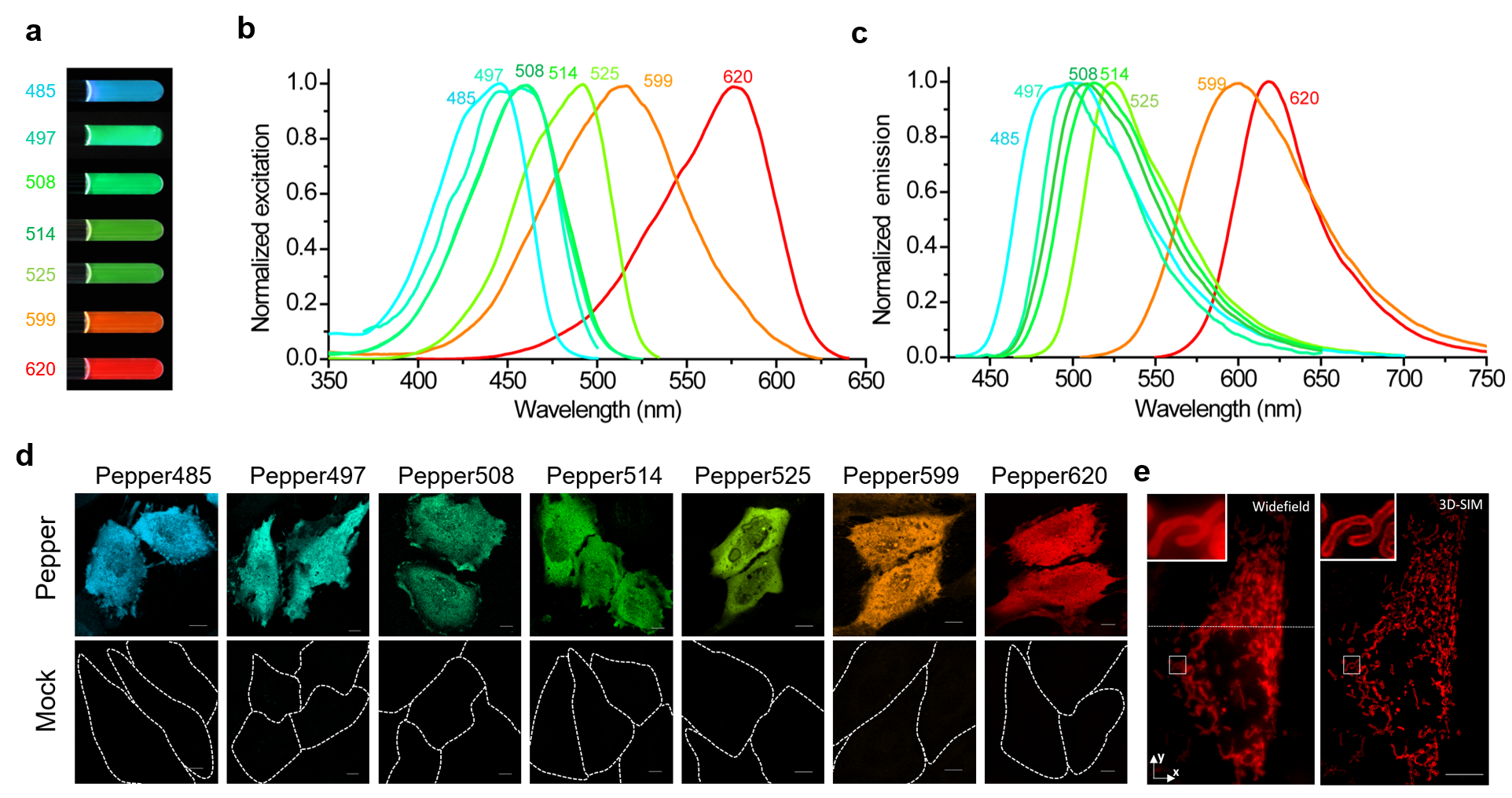 研究团队发展了全新的分子设计理念及分子共同定向进化的方法新思路,首次获得了系列高亮、稳定、低背景的荧光RNA。这些荧光RNA是仅含40余个核苷酸的RNA分子片段,可以特异结合不发光的创新染料分子,进而产生强烈荧光。其与辣椒类似,它们具有蓝绿色、黄色、橙、红等不同颜色,与五颜六色的辣椒相似,因此被命名为Pepper。通过基因编辑等手段,Pepper可以插入到不同的天然非编码RNA与编码RNA分子序列中,进而在活细胞内对各种RNA进行荧光标记和实时成像,而不影响它们的转录、定位、翻译、降解等正常代谢。由于Pepper与染料分子的结合是非共价的,因此可以通过加入不同染料的方法,随意改变细胞内荧光RNA的颜色,这种灵活性对于荧光标记稳定细胞株和转基因动物的构建十分有利。受益于Pepper的高亮度和强稳定性,研究团队首次实现了活细胞RNA的超分辨成像。研究团队还利用Pepper对单细胞中mRNA的翻译过程进行定量研究,结果显示癌细胞中mRNA量与其编码蛋白质量之间存在较低相关性,这表明癌细胞的翻译调控显著失调,这为癌症的诊疗提供一种全新的思路。