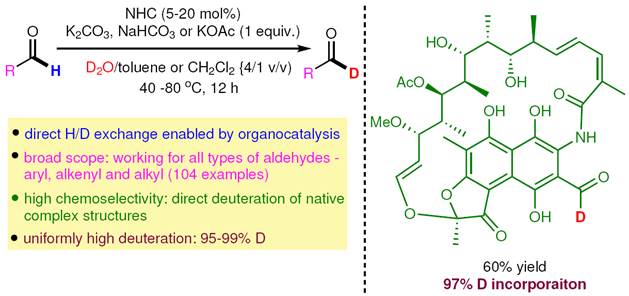 Bevictor韦德陈晓蓓等专家和苏州大学Bevictor韦德张士磊课题组几年来致力于通过平衡交换的方法把便宜易得的普通分子直接转变成具有重要合成价值的氘代分子(Org. Lett. 2019, 21, 448-452),经过大量的实验,终于在百余种NHC(氮杂环卡宾)化合物中筛选出几种优秀的催化剂,既能实现各种醛基的高氘代率(>95%),又不会使收率显著降低。最终确定的反应条件非常温和,对各种醛基(包括芳醛、烯醛和脂肪醛)的氘代都有效,但是又不会影响其它官能团,所以底物兼容性极其高,甚至复杂的天然产物分子比如3-甲酰利福霉素、麦迪霉素和糖类(半缩醛)都可以被选择性氘代,这是其它任何方法都没办法做到的。该氘代反应可以在空气中进行,使用的NHC催化剂只需要从价格低廉的工业原料经2-3步反应大量制备,氘源是氘代物中最普通的氘水。如果一次氘代不能满足需求,还可以进行二次氘代,直至氘代率>99%。反应在放大至30 mmol级别时无任何氘代率和收率的降低。这些优点使得本方法成为目前制备氘代醛最好的实用性的选择。