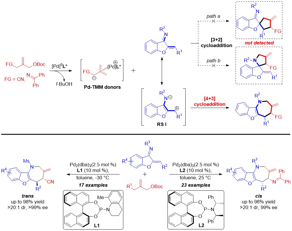三亚甲基甲烷(TMM)作为一类重要的全碳1,3-偶极子,被广泛用于多种五元环类化合物及天然产物的合成中。然而相较于已经发展的非常成熟的TMM参与的[3+2]环加成反应,其参与的不对称[4+3]环加成反应则未见报道,主要原因在于该反应过程中存在区域选择性及立体选择性调控的难题。为了解决这一科学难题,邓卫平教授团队以橙酮亚胺作为四元氮杂双烯,巧妙地实现了钯催化TMM的不对称[4+3]环加成反应,并且成功抑制了潜在的[3+2]环加成反应过程,实现了高度专一的区域选择性调控,该反应以优秀的收率(84%-98%)、优秀的非对映及对映选择性(9:1- >20:1 dr, 94%- >99% ee)合成了一系列结构多样的手性氮杂卓类化合物。值得注意的是,亚氨基和氰基取代的TMM底物,分别专一的得到了cis和trans构型的环加成产物,从而实现了立体多样性合成。上述工作拓展了催化不对称[4+3]环加成反应的类型,为手性氮杂卓类化合物的高效合成提供了新的思路,从而为创新药物研发提供了重要的分子实体。