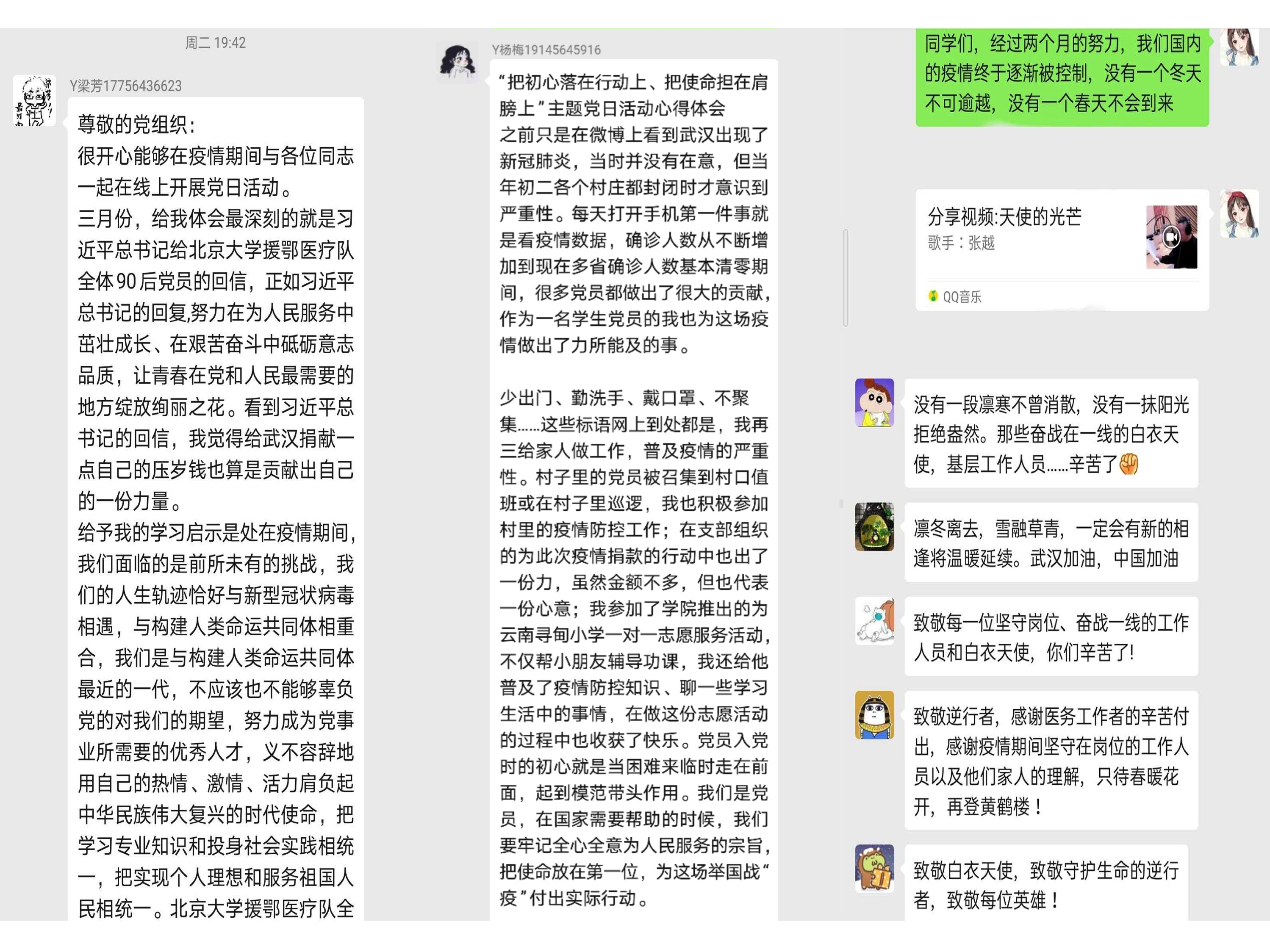 药物化工所研究生第一党支部与2019级研究生第三党支部在本次党日活动中与支部同学分享了支部发起与寻甸孩子一对一“云补习”活动的初心和目前的进展,支部许多与寻甸孩子结对的志愿者同学也纷纷“晒”出自己与结对孩子间的“幸福刹那”。有党员志愿者表示自己在看到活动召集令的时候,觉得上面“需尽心但可为”这句话说的特别好,尤其通过这次战“疫”我们更是深刻地认识到了人民的力量,如果我们每一位党员都能尽心尽力地去做到我们能够做到的那一点点小事,担负起我们肩上我们以现在能力能负担的起的那一点点责任,我们便一定能协力为这个社会做出大大的贡献。