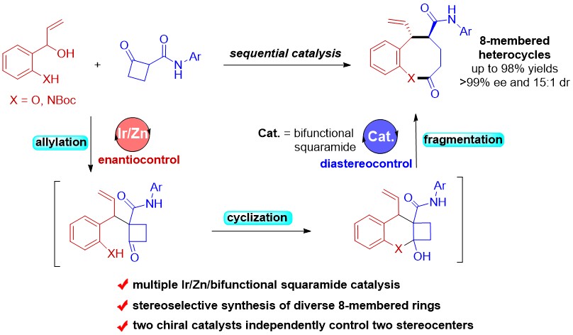 手性八元杂环是一类重要的中环骨架,广泛存在于多种药物分子和活性天然产物中,开发其高效、高立体选择性合成方法是有机合成化学和药物化学领域的研究热点之一。然而,由于构建该类中环骨架过程中会出现不利的焓变和熵变以及跨环相互作用,所以实现该类结构的高立体选择性合成存在较大挑战。为了解决这一科学难题,该研究团队提出金属/有机小分子连续催化烯丙基取代/扩环级联反应的策略,首先经金属铱催化的烯丙基取代/分子内环化得到高张力的多环中间体,然后通过有机双功能催化剂促进的开环反应步骤,进而构建八元杂环骨架。该反应策略从根本上避免了八元环传统合成方法中存在的不利焓变和熵变因素,为手性中环化合物的合成提供了新方法。底物普适性研究证明了该反应良好的底物兼容性,以中等至优秀的收率(62-98%)和优秀的立体选择性(85->99% ee, 8:1-15:1 dr)合成了一系列手性苯并氧杂八元环和苯并氮杂八元环衍生物,为进一步开展创新药物研究和新型农药创制提供了结构新颖的分子实体。此外,详细的机理研究和DFT理论计算证实了手性金属铱催化剂控制烯丙基取代反应的对映选择性,而手性双功能有机催化剂控制了扩环反应的非对映选择性,这种新颖的立体化学控制模式,为后续开发连续催化不对称反应提供了新思路。