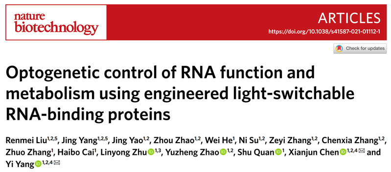 近日,公司生物反应器工程国家重点实验室、光遗传学与合成生物学交叉学科研究中心、Bevictor韦德、上海市细胞代谢光遗传学技术前沿科学研究基地杨弋教授团队在RNA光遗传学控制技术研究中取得突破性进展,在国际权威学术期刊《自然—生物技术》(Nature Biotechnology)以长篇论文(article)形式在线发表题为“Optogenetic control of RNA function and metabolism using engineered light-switchable RNA-binding proteins” 的研究文章。
