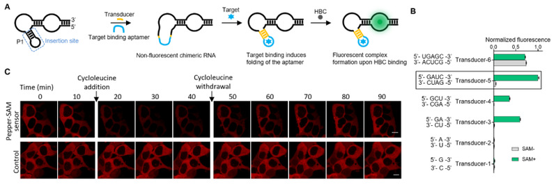 细胞内各类代谢物在生命活动中起着至关重要的作用,对细胞内代谢物的监测可以为代谢研究、临床诊断及治疗提供有力的工具。然而,活细胞内的代谢物呈现高度的时空动态分布,它们往往需要在正确的时间和空间以正确的数量才能行使其生理功能,这为细胞内代谢物的监测带来了极大的挑战。此前,基于荧光蛋白的遗传编码荧光探针已被广泛用于活细胞内代谢物的实时监测。然而,由于能够特异性结合靶标并在靶标结合时发生较大构象变化的变构蛋白数量十分有限,荧光蛋白探针的底物选择范围有限,无法实现对许多关键代谢物的实时监测。此外,绝大多数高性能荧光蛋白探针都是黄绿色的,这也一定程度上限制了其在多色标记与活体成像中的应用。近年来,基于荧光RNA开发的遗传编码荧光探针为活细胞代谢监测带来新的机遇。识别特定靶标代谢分子的RNA适配体可以通过体外筛选得到,核糖开关中还存在许多天然的适配体。理论上,针对任何代谢物小分子或者蛋白等大分子,基于荧光 RNA 技术都可能发展出相应的传感器,这有助于突破现有传感器种类缺乏多样性的限制,大大扩展传感器的应用领域