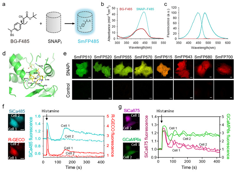 研究团队首先针对自催化蛋白质标签SNAP-tag设计开发了高信噪比的青色人造荧光蛋白SmFP485。SmFP485的荧光产生十分迅速,避免荧光蛋白生色团成熟导致的延迟,因此可以用于实时监测蛋白质的合成过程。研究团队随后对SmFP485的结构进行了解析,探究了人造荧光蛋白的荧光激活原理。在此基础上,研究团队通过化学进化的方法设计出了一系列光谱覆盖绿色到近红外波段的人造荧光蛋白,它们均具有高亮度和高信噪比的特点,特别是其在近红外波段的亮度已远超现有的成像工具,能够对活细胞以及活体动物中的蛋白质表达、蛋白质降解、蛋白质组装、蛋白质相互作用以及蛋白质运输进行原位实时标记与成像。最后,研究团队在多色人造荧光蛋白的基础上,采用蛋白质与荧光团共进化的方法设计开发出一系列光谱涵盖青色到近红外波段的钙离子遗传编码荧光探针,实现了对哺乳动物细胞中钙离子震荡的实时监测,为荧光探针的构建提供新的荧光载体。综上,研究团队开发了一系列高性能拟荧光蛋白,它们具有荧光产生迅速、亮度高、信噪比高、光谱范围广等优点,为活细胞以及活体动物中蛋白质的可视化提供了有力的工具,同时也为荧光探针的构建提供了新的思路和策略。
