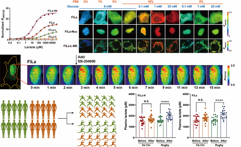 本研究中,研究团队系统性地发展了基于乳酸探针的“跨尺度”监测分析技术体系,涵盖单细胞、亚细胞、在体以及体液水平。该技术体系含有不同亲和力的乳酸探针,可根据应用场景选择合适的FiLa,形成相对完备的工具箱。FiLa家族探针可应用于亚细胞水平能量代谢的实时分析,结合营养、药理、遗传等操纵手段,能够方便快速地获得关于乳酸时空动态变化的丰富信息,其特异性、灵敏度、时空分辨率相比于Seahorse能量分析技术具有“质”的提升。