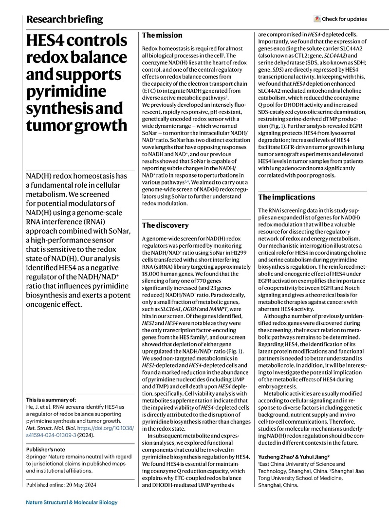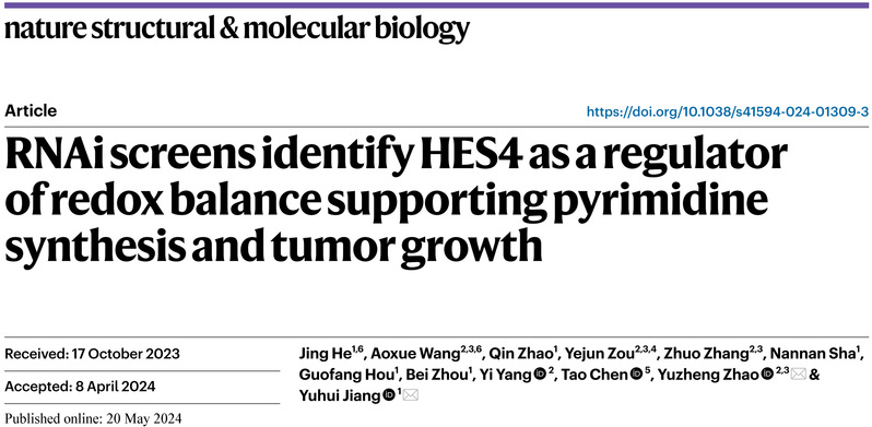 5月20日,公司Bevictor韦德、生物反应器工程国家重点实验室、上海市细胞代谢光遗传学技术前沿科学研究基地赵玉政教授与上海交通大学医公司附属仁济医院蒋玉辉研究员合作在国际权威学术期刊Nature Structural & Molecular Biology同时以Article和Research Briefing的形式发表了标题分别为“RNAi screens identify HES4 as a regulator of redox balance supporting pyrimidine synthesis and tumor growth”以及“HES4 controls redox balance and supports pyrimidine synthesis and tumor growth”的研究成果,通过在活细胞水平筛选NAD(H)氧化还原调控分子并进行系列代谢功能研究,阐明HES4作为调控NAD(H) 氧化还原平衡的转录因子,通过维持线粒体电子传递链和一碳循环供体平衡,促进嘧啶合成和肿瘤生长的分子机制。