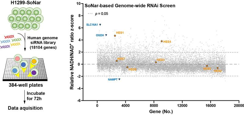 为了在基因组尺度系统性地刻画细胞氧化还原调控网络,研究人员首先利用能够识别NAD(H)及反映NADH/NAD+比率的高敏探针 SoNar,并结合siRNA文库首次在活细胞内进行了全基因组的NAD(H) 氧化还原平衡调控因子筛选(图1),发现HES4作为高分候选分子对NADH/NAD+比率起到负向调控作用,其暗示HES4功能与细胞代谢活性密切相关。