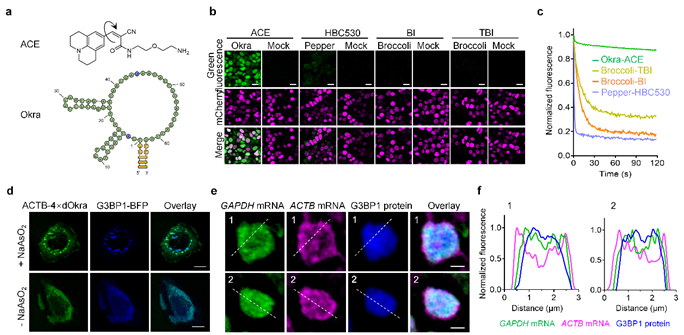 针对上述技术挑战,研究团队创新发展了具有高亮度和高稳定性的新型绿色荧光RNA,称为Okra505。Okra505由Okra RNA适配体和新型荧光团分子ACE构成,Okra可以以纳摩尔级的高亲和力结合ACE,并显著激活其产生明亮的绿色荧光。Okra505具有低Mg2+依赖性、高温度稳定性、高pH耐受性、不含有G-四链体等优点。进一步研究结果表明,Okra505在活细胞成像亮度以及光稳定性方面相较于前人报道的绿色荧光RNA提升了1-2个数量级,可实现细菌和哺乳动物细胞内低丰度mRNA的高亮度和低背景成像。受益于高亮度和高光稳定性的优点,Okra505可以被用于实时监测哺乳动物细胞内应激颗粒(Stress granules,SGs)的形成以及解聚过程,以及探究ATP能量分子对应激颗粒动力学过程的影响。通过与Pepper620联合实用,Okra505还可被用于应激颗粒内不同mRNA分布的结构光照明超分辨成像(SIM),揭示了不同mRNA在颗粒中分布的异质性和不均一性。