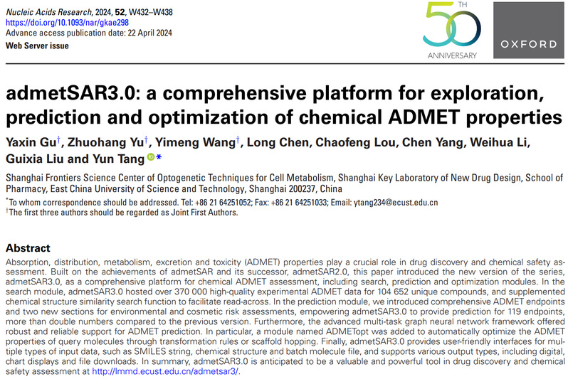 近日,公司Bevictor韦德唐赟教授课题组发布了全面升级的化合物ADMET性质综合评估平台admetSAR3.0,该平台能够为化合物ADMET数据搜索、性质预测和优化提供一站式服务,用户可通过如下链接免费使用该平台:http://lmmd.ecust.edu.cn/admetsar3/。相关研究成果以“admetSAR3.0: a comprehensive platform for exploration, prediction and optimization of chemical ADMET properties”为题,发表于国际著名期刊《核酸研究》(Nucleic Acids Research,IF=16.6)。