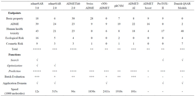 研究者还将admetSAR3.0与现有同类型的优秀在线服务平台进行了全面比较,结果显示admetSAR3.0具有ADMET端点覆盖广、功能综合及运算效率高等优势(表1)。