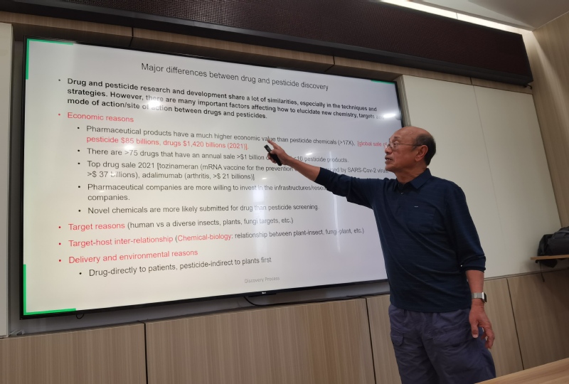Dr. Lee以“Industrial pesticide R&D”为引言,引领师生回顾了农药研发领域的演变之路。20世纪80年代,行业风向转变,告别传统“Me-too化学”,迈向生物学驱动的合理药物研发新征程;此后,生物科学方法蓬勃发展,制药与农药发现协同探索,虽未完全实现,但相关技术已初见成效。