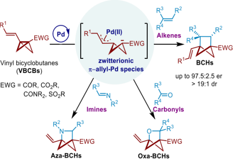 近日,公司Bevictor韦德的郑军教授在ACS Catalysis发表了题为“Zwitterionic π‑Allyl-Pd Species Enabled [2σ+2π] Cycloaddition Reactions of Vinylbicyclo[1.1.0]butanes (VBCBs) with Alkenes, Carbonyls, and Imines”的研究成果。该工作开发了烯基双环[1.1.0]丁烷(VBCBs)作为一种通用的合成子,应用于钯催化的[2s+2p]环加成反应,成功实现了与多种2p体系(包括烯烃、醛、酮和亚胺)的环加成反应,多样性地合成了具有潜在药用价值的全碳、氮杂和氧杂环双环[2.1.1]己烷骨架,为进一步新药研发中的苯环生物电子等排体提供了新的合成策略。