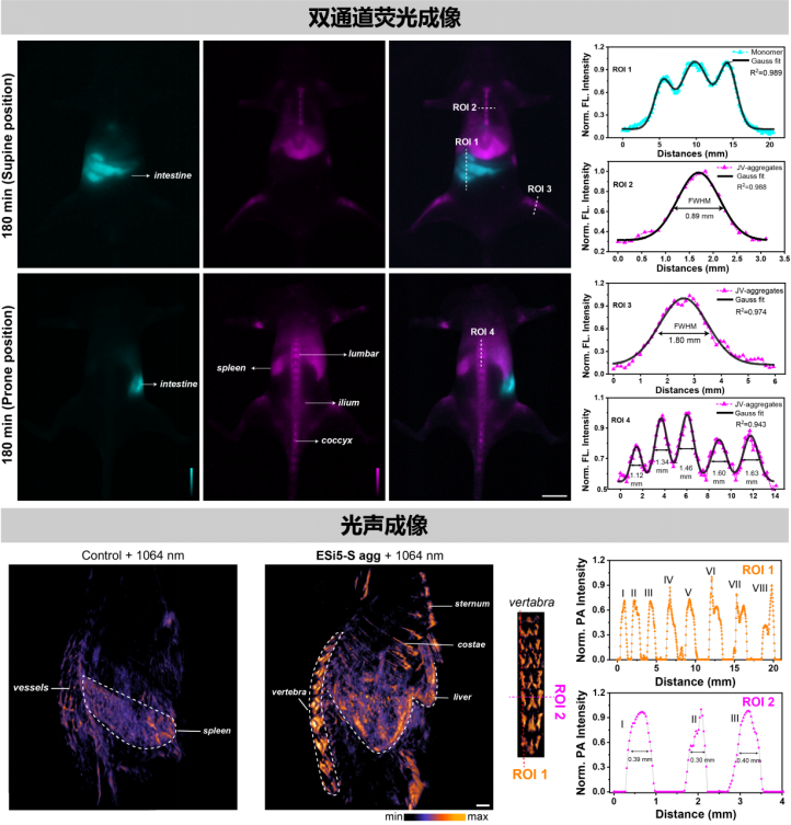 这类短波红外聚集体具有高稳定性、高生物相容性、易制备的特点,因此在生物成像/治疗中具有广泛的应用潜力。ESi5-S聚集体经尾静脉注射,潴留在小鼠全身骨骼、肝脏和脾脏,并经肝胆代谢后解聚为单体,通过808/1064nm激光激发可以实现双通道荧光成像。该成像结果表明聚集体的荧光成像潜力,揭示其活体内代谢途径。此外,ESi5-S聚集体同样是合适的光声成像材料,溶液中的光声测试表明其光声信号强度为同浓度IR-1061的3.5倍。活体内的光声成像实现了对小鼠骨骼的三维重构,可以清晰显示胸骨、肋骨及腰椎,表明其优异的光声成像性能。