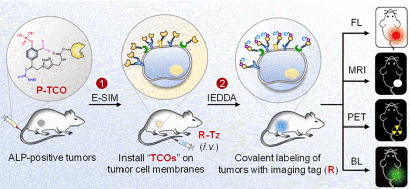此外,谢贺新教授课题组与南京大学叶德举教授团队、江苏省原子医学研究所林建国研究员团队合作,在预靶向多模态活体动物肿瘤成像取得最新进展,相关成果以“Pretargeted Multimodal Tumor Imaging by Enzymatic Self-Immobilization Labeling and Bioorthogonal Reaction”为题发表在Journal of the American Chemical Society。该研究以研究团队前期发展的碱性磷酸酶自锚定探针(Chem. Eur. J. 2019, 25, 13994)为预靶向基团,通过亚甲基苯醌中间体的形成将反式环辛烯(TCO)选择性共价标记在活体动物肿瘤细胞膜上,进而通过快速的生物正交反应,将含有四嗪的各种信号报告基团(如荧光染料、磁纳米粒子、放射性核素、生物发光蛋白等)选择性富集在肿瘤细胞中,从而实现对活体小鼠肿瘤的高灵敏荧光、核磁共振、正电子发射断层及生物发光等多模态成像。南京大学博士研究生缪银杏、副研究员王宇琦、Bevictor韦德博士研究生陈叶锋为论文共同第一作者,谢贺新、林建国和叶德举为论文共同通讯作者。