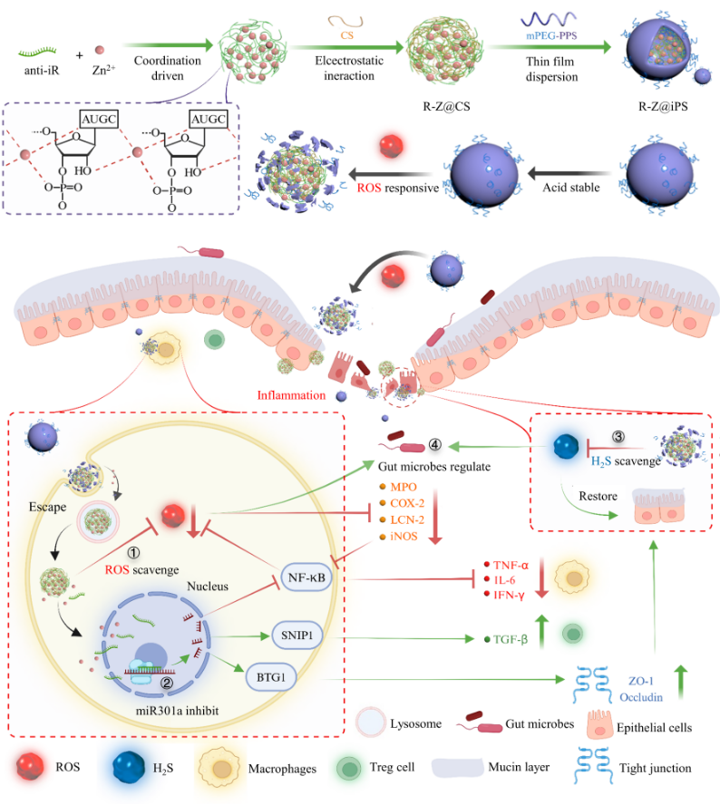 图1 基于anti-miR-301a和锌配位的口服ROS响应纳米递药平台调控炎症肠道微环境示意图