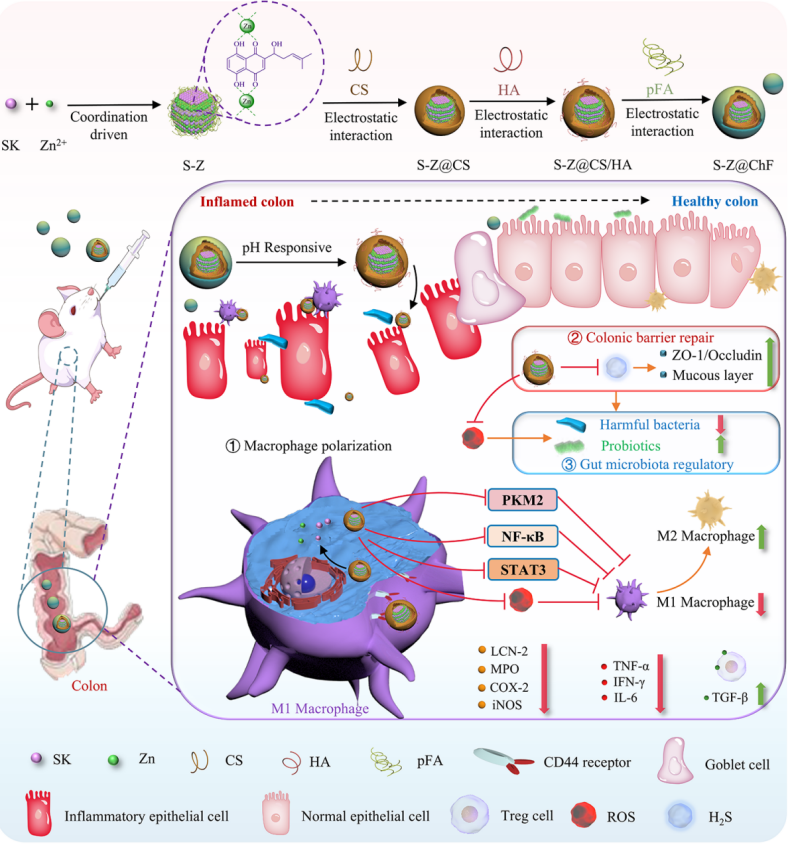图2 基于紫草素和锌配位的口服pH响应纳米递药平台调控炎症肠道微环境示意图